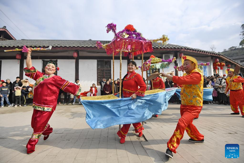 Volunteers perform at Zhouzi ancient town in Peng'an County of Nanchong City, southwest China's Sichuan Province, Feb. 13, 2022. Various events are held across China to celebrate the upcoming Lantern Festival. (Photo by Li Xiangyu/Xinhua)