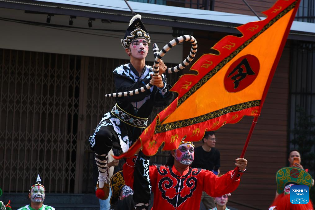 Members of Nigou Yingge Team from Puning, China's Guangdong Province, perform in the district of Phanat Nikhom in Chonburi province, Thailand, Feb. 28, 2026. (Xinhua/Sun Weitong)