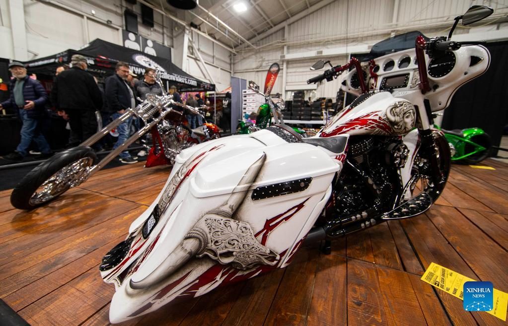 People look at customized motorcycles during the 2022 North American International Motorcycle Supershow in Mississauga, the Greater Toronto Area, Canada, on March 25, 2022. The three-day event kicked off here on Friday with hundreds of different models of motorcycles. (Photo by Zou Zheng/Xinhua)