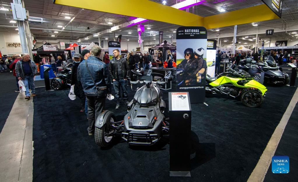People visit the 2022 North American International Motorcycle Supershow in Mississauga, the Greater Toronto Area, Canada, on March 25, 2022. The three-day event kicked off here on Friday with hundreds of different models of motorcycles. (Photo by Zou Zheng/Xinhua)