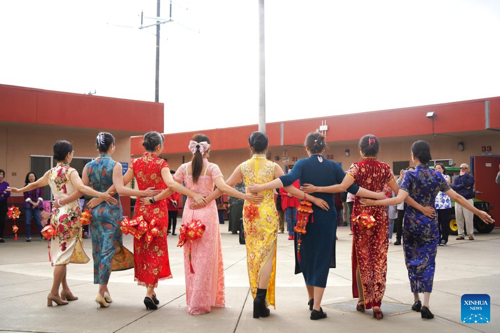 People in traditional Chinese Qipao (cheongsam) perform during a Lantern Festival celebration at a school in San Francisco, the United States, March 3, 2026.
