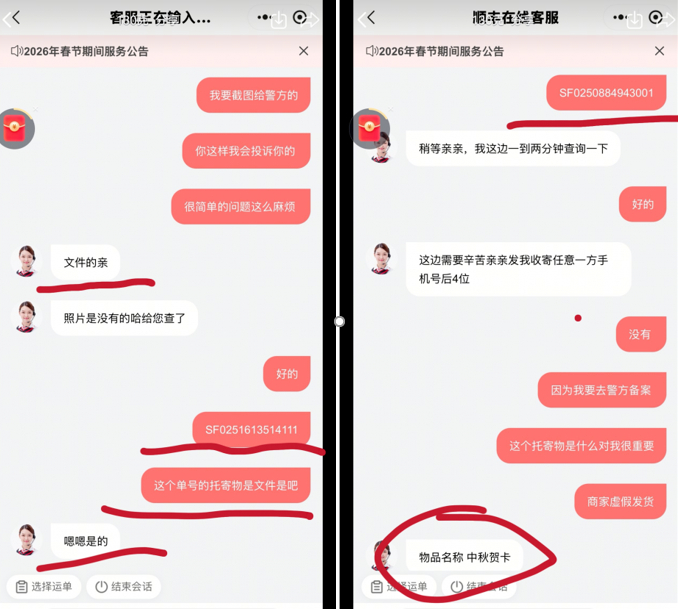 袁女士联系顺丰物流被告知商家发到质检基地的物品为“中秋贺卡”。(图片来自“人民投诉”用户)