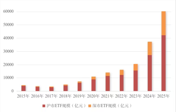 2025年,随着《关于推动中长期资金入市工作的实施方案》《促进资本市场指数化投资高质量发展行动方案》《推动公募基金高质量发展行动方案》等一揽子政策相继落地实施,伴随市场有效性提升,ETF市场结构不断优化,投资生态持续完善,在引导增量资金入市、服务实体经济以及居民财富管理需求、拓宽中长期资金入市渠道、提升投资者获得感、稳步扩大资本市场高水平制度型开放等方面发挥了积极作用。境内ETF市场规模先后突破4万亿元、5万亿元、6万亿元,超过日本成为亚洲第一大ETF市场。