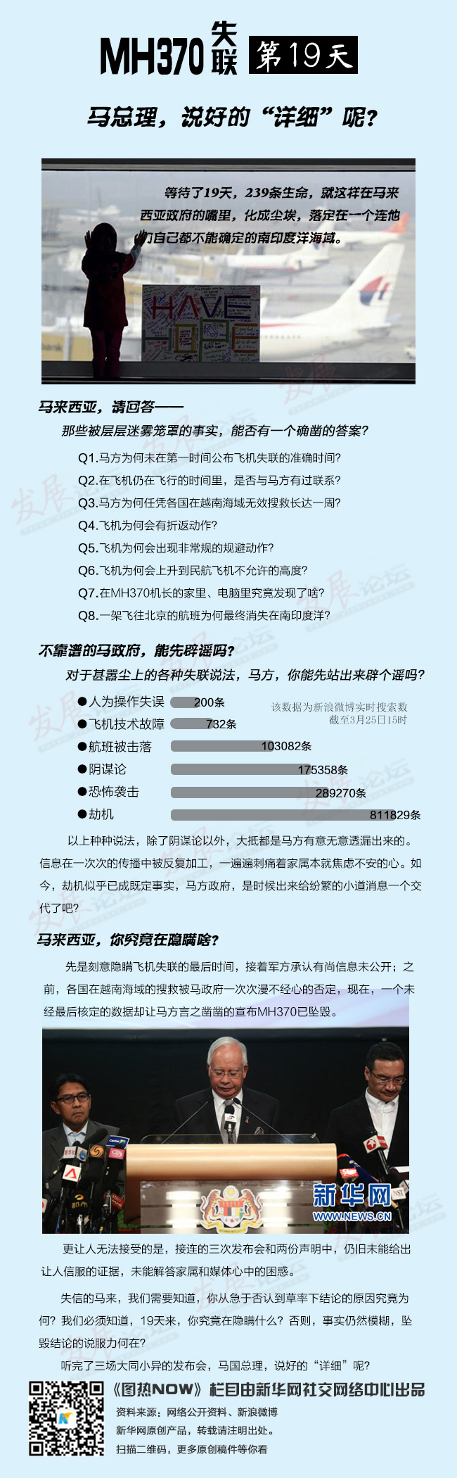 等待了19天,239條生命,就這樣在馬來西亞政府的嘴里,化成塵埃,落定在一個連他們自己都不能確定的南印度洋海域。事實仍然模糊,結(jié)論的說服力何在?馬國總理,你說好的“詳細”呢?