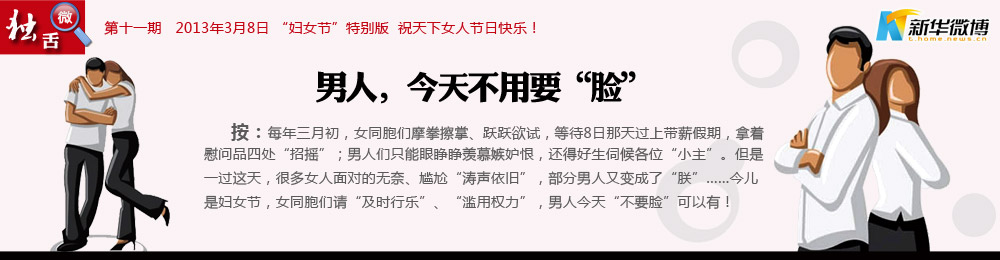 @蘄鄉(xiāng)農(nóng)夫: 在婦女節(jié)到來之時(shí),向長(zhǎng)期戰(zhàn)斗在試衣間,看韓劇,不做飯,魅力十足并掌握另一半錢包的杰出女性們致以節(jié)日的問候。祝所有美女們:三圍魔鬼化,收入白領(lǐng)化,家務(wù)甩手化,快樂日?;?,愛情持久化,情調(diào)小資化,購物瘋狂化,老公奴隸化,祝三八婦女節(jié)快樂!