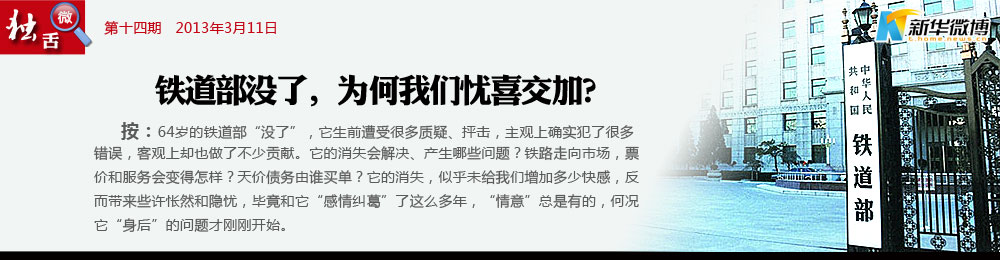 @秋水伊人:之前累積的債務(wù)問(wèn)題如何解決?誰(shuí)是還債主體?明年春運(yùn)被“吐槽”的是誰(shuí)?撤銷(xiāo)鐵道部體現(xiàn)了改革的決心,希望能有好的轉(zhuǎn)變。
