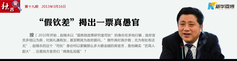 一句話告訴你真相 一句話評(píng)趙錫永事件:騙子騙術(shù)并不高明,只是這些地方官員見(jiàn)到“上面”來(lái)的,便做條件反射式的恭迎,而不敢去做辨別,唯恐犯了大不敬,背后還是“官本位”的思想在作怪。