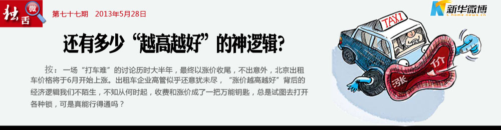 面對(duì)漲價(jià),吐槽無(wú)力 節(jié)約用電,電費(fèi)漲價(jià);節(jié)約用水,水費(fèi)漲價(jià);控制人口,超生罰款;解決打車(chē)難,出租車(chē)漲價(jià)……漲價(jià),似乎成了有關(guān)部門(mén)的“法寶”。對(duì)大多數(shù)網(wǎng)友來(lái)說(shuō),也只能無(wú)力吐槽句:“居民喜迎X價(jià)上漲。”