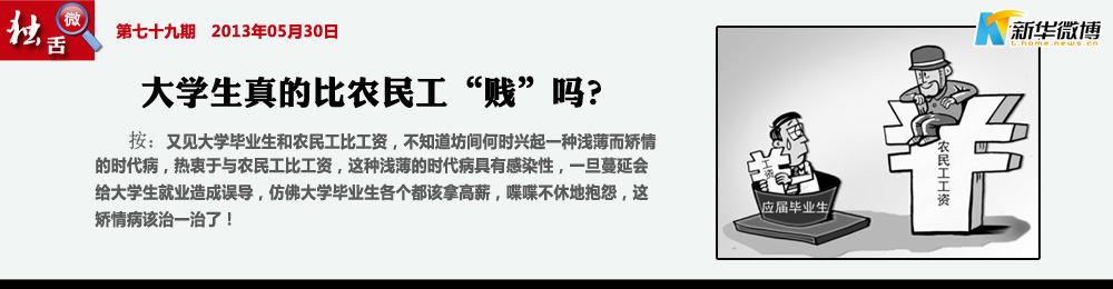 【新名詞:大學(xué)生農(nóng)民工】 他們出身農(nóng)村、考上大學(xué)進入城市,畢業(yè)后與進城打工的父兄匯流,又重新站在了同一條起跑線上;他們與新生代農(nóng)民工職業(yè)混同,工資相差無幾,生活境遇同樣是在城鄉(xiāng)之間漂浮。對這樣一個近幾年涌現(xiàn)的年輕人群體,我們稱之為“大學(xué)生農(nóng)民工”。