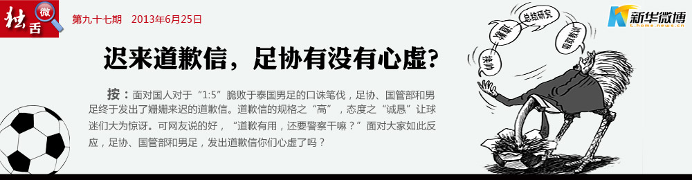 央視也不能忍了 “這樣的檢查沒(méi)有觸及靈魂,應(yīng)該打回去重寫(xiě)?!薄胍曉u(píng)足協(xié)道歉。足協(xié)、國(guó)管、國(guó)足上演道歉信帽子戲法,怎么看怎么像兒戲,別說(shuō)觸及靈魂了,純屬耍嘴皮子。