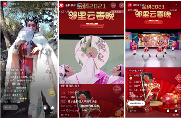金科積極響應(yīng)政府號召,也深度洞察人們對團圓的期盼,2月5日,集團品牌統(tǒng)籌舉辦了“金科2021鄰里云春晚”。通過一場鄰里春晚直播,打破了疫情防控常態(tài)化下的空間壁壘,讓全國百萬業(yè)主實現(xiàn)線上團圓。