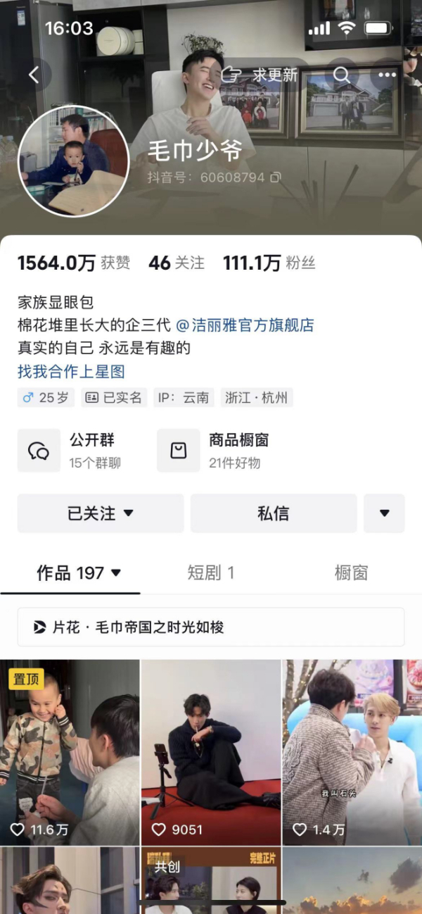 2024年,洁丽雅企三代石展承以抖音《毛巾帝国》系列短视频破圈,成为内容创作者“毛巾少爷”,同时也让洁丽雅的品牌于年轻群体中再次焕发新生。这位“创三代”希望通过“毛巾少爷”的账号展示品牌背后的人和事,让洁丽雅以另一种更为年轻群体喜爱的方式走进大众视野,以此拉近和消费者的距离。