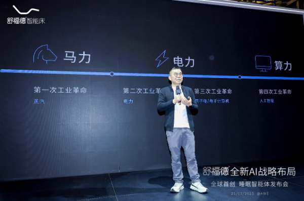 AI战略布局首创睡眠智能体发布会现场,麒盛科技总经理黄小卫指出算力革命不仅是技术迭代,更是社会运行方式的根本变革。通过云计算与AI技术的发展,人类可更高效得调取资源,舒福德AI小舒正在打破科技发展与人类睡眠之间的困境,真正实现科技以人为本。