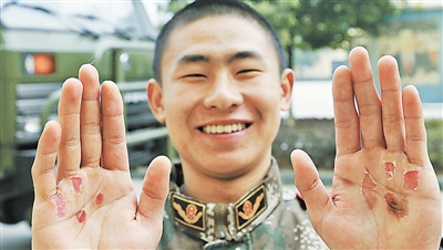 ??? 武警四川省總隊樂山市支隊官兵在嚴格訓(xùn)練中得到鍛煉。圖為2014年12月14日,戰(zhàn)士楊忠微笑著展示自己的訓(xùn)練“成果”。李華時 攝