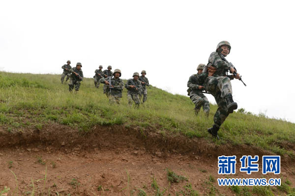 ????陸軍第39集團(tuán)軍某紅軍旅官兵在演習(xí)中發(fā)起沖鋒(2016年5月14日攝)。