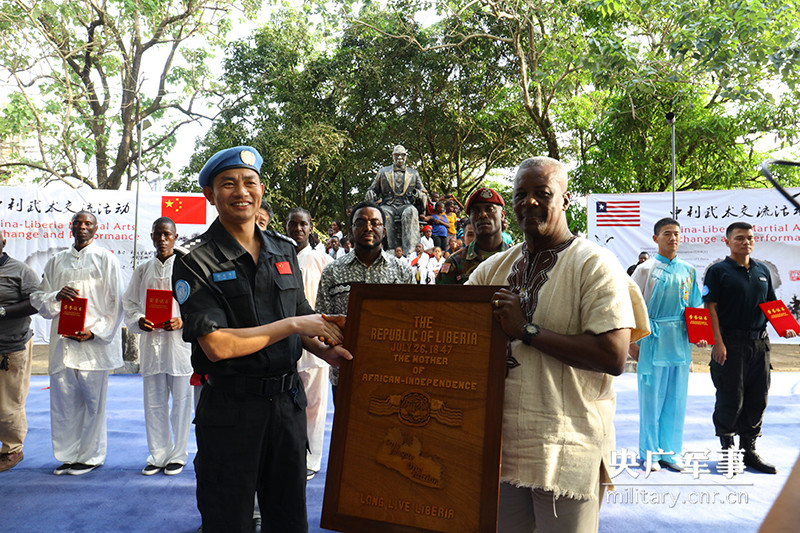 ????交流活動還舉行了“中利文化武術(shù)交流使者”聘任儀式。在中國駐利比里亞大使張越、利比里亞總參謀長贊凱、教育部部長喬治?沃納等官員的見證下,中國防暴隊政委徐曉偉、利國武協(xié)主席普萊特代表中利武術(shù)聯(lián)誼單位,相互交換了紀念品,給8名中利文化武術(shù)交流使者頒發(fā)了聘書、并掀展聯(lián)誼旗幟合影留念,得到現(xiàn)場官員、師生雷鳴般掌聲和高呼贊賞。