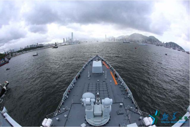 ↑7月7日,海軍濟南艦緩緩駛?cè)胂愀郯捍薮a頭。新華社記者 曾濤 攝