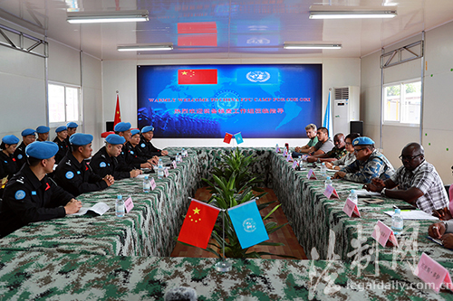 圖為中國駐利防暴隊(duì)與聯(lián)利團(tuán)裝備核查組召開會議
