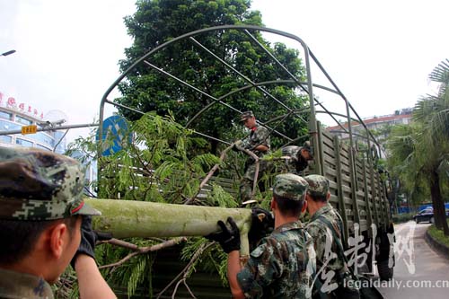 ????自8月23日開始,今年第13、14號臺風“天鴿”、“帕卡”相繼在廣東沿海登陸。位于臺風登陸途徑的廣東省江門市遭受了嚴重的破壞,市區(qū)道路兩邊大量樹木被吹倒,甚至被連根拔起。為最大限度減少臺風帶來的損失,8月24日至8月28日,廣東邊防總隊江門邊檢站官兵積極響應江門市委、市政府的號召,迅速動員部署,先后組織200余名官兵深入駐地受災街道開展災后清理工作,幫助群眾重建家園,以實際行動踐行全心全意為人民服務的宗旨,受到駐地黨政職能部門和人民群眾的一致好評。