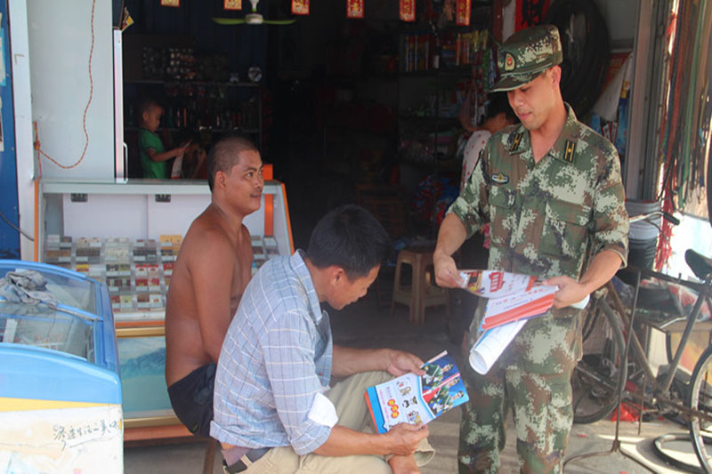 邊防官兵正在向群眾發(fā)放宣傳資料。