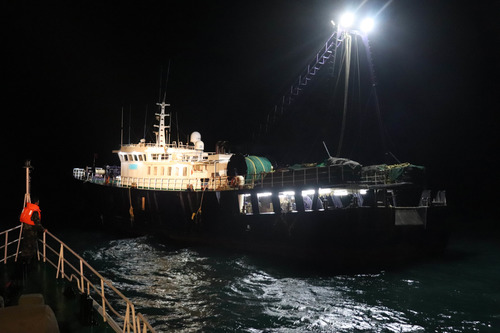 ????被海警執(zhí)法員發(fā)現(xiàn)的走私集團的供油母船(12月13日攝)。新華社發(fā)(敖玉洪 攝)