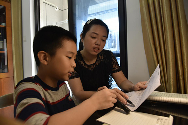 鄭如輔導(dǎo)大兒子做作業(yè)。