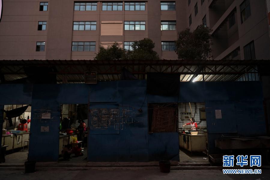 1月26日,在福建省石獅市的金利萊斯服裝廠,黃海龍的妻子黃愛華(右)在廚房做飯,其他工友也在一旁做飯。