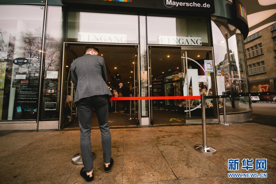 3月8日,德國科隆一家書店的工作人員在入口處拉起護(hù)欄,限制客流。
