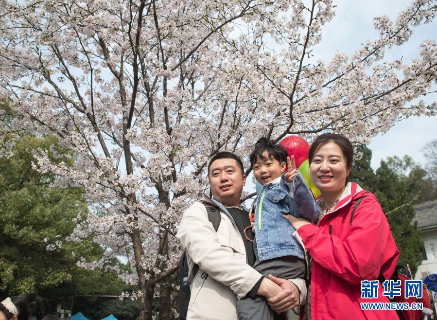 3月13日,遼寧援鄂醫(yī)療隊(duì)丹東市中心醫(yī)院護(hù)士李杰(右)與家人在武漢大學(xué)櫻花樹(shù)下合影。新華社記者 肖藝九 攝