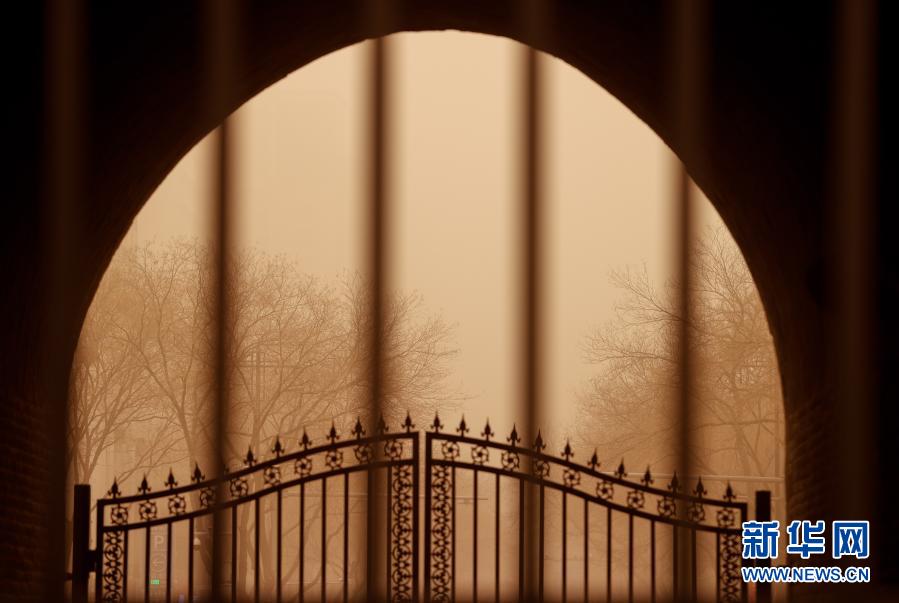 這是3月15日拍攝的沙塵中的寧夏銀川鼓樓拱門。當(dāng)日,我國(guó)北方多地出現(xiàn)沙塵天氣。新華社記者 楊植森 攝