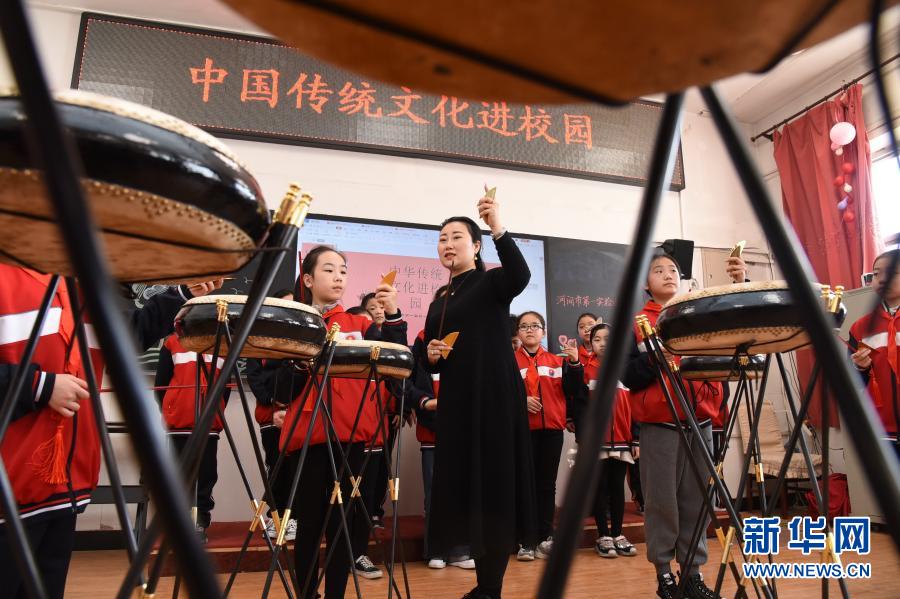 3月17日,西河大鼓藝人在河間市第一實驗小學(xué)指導(dǎo)學(xué)生練習(xí)西河大鼓。
