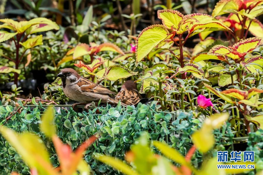 3月18日,在位于馬尼拉的菲律賓大學附屬菲律賓總醫(yī)院,兩只麻雀站在“低語的花床”藝術裝置上。