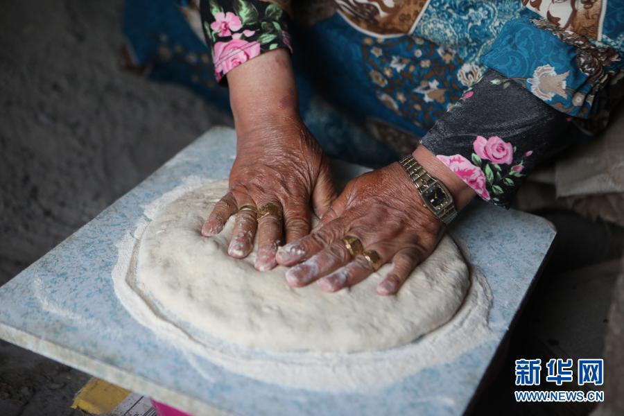 3月17日,70歲的卡茲蘭·阿布·卡巴什在約旦河西岸城市希伯倫附近的一個(gè)村莊制作“塔本”烤餅。