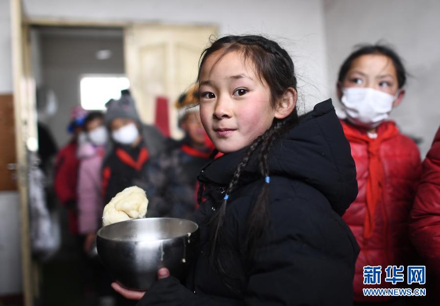 3月16日,在索加鄉(xiāng)寄宿小學(xué)食堂,白瑪措毛(前)和同學(xué)們一起打飯。