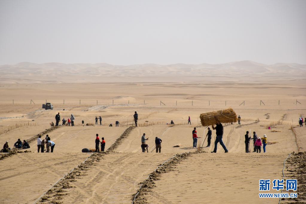 3月28日,人們在且末縣城不遠(yuǎn)處的塔克拉瑪干沙漠內(nèi)植樹。