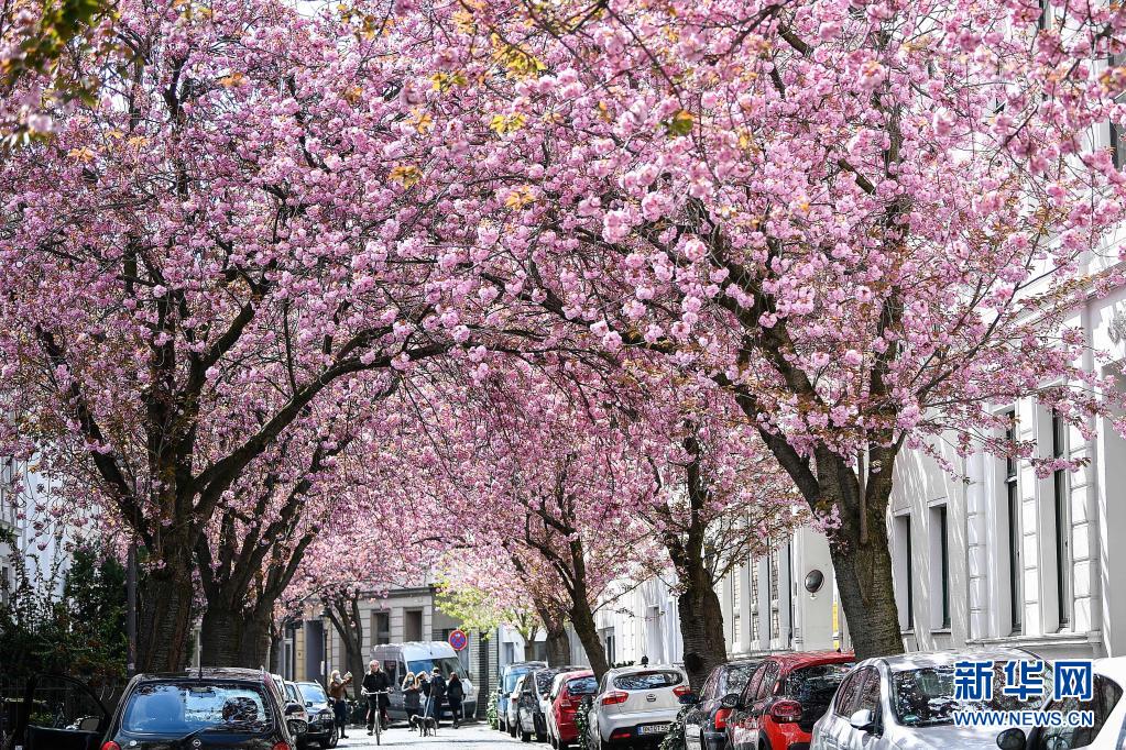 近日,德國西部城市波恩老城區(qū)的櫻花盛開,吸引了許多游人前來觀賞。