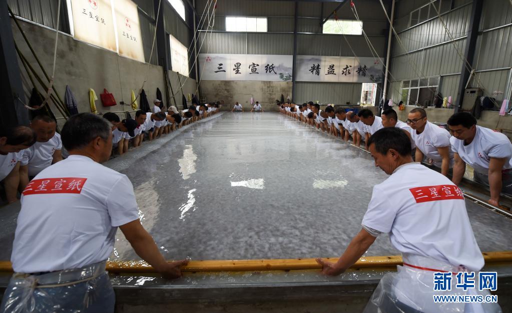 近日,在宣紙產(chǎn)地安徽省宣城市涇縣,“四丈宣紙”的抄制在一家紙業(yè)有限公司啟動(dòng)。50余名撈紙師傅操作巨型紙簾,齊心協(xié)力,在紙槽旁進(jìn)行撈紙作業(yè)。來回起落兩次,動(dòng)作整齊劃一。隨后工人們將紙簾吊起放至一邊揭下,一張巨大的宣紙便撈制成功。經(jīng)過曬、剪等工序后, 制成長13.2米、寬3.6米的巨型宣紙就是“四丈宣紙”。