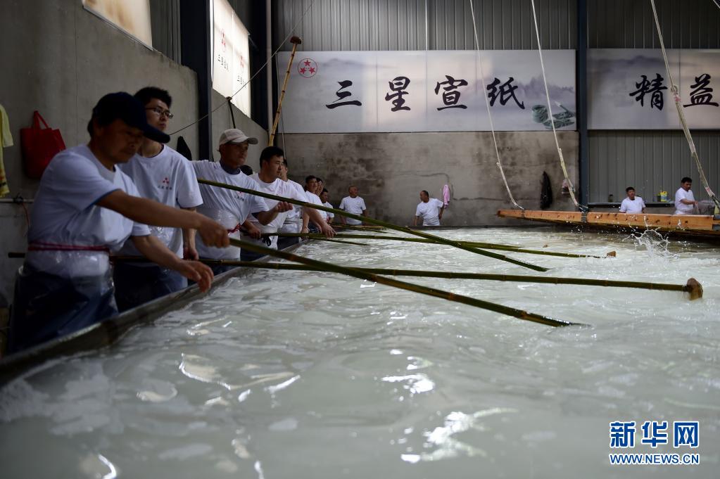 近日,在宣紙產(chǎn)地安徽省宣城市涇縣,“四丈宣紙”的抄制在一家紙業(yè)有限公司啟動。50余名撈紙師傅操作巨型紙簾,齊心協(xié)力,在紙槽旁進行撈紙作業(yè)。來回起落兩次,動作整齊劃一。隨后工人們將紙簾吊起放至一邊揭下,一張巨大的宣紙便撈制成功。經(jīng)過曬、剪等工序后, 制成長13.2米、寬3.6米的巨型宣紙就是“四丈宣紙”。