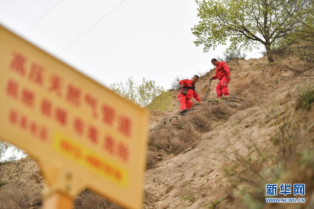 4月27日,巡線隊員張偉偉(右)、張浩軍在巡線途中。新華社記者 張博文 攝