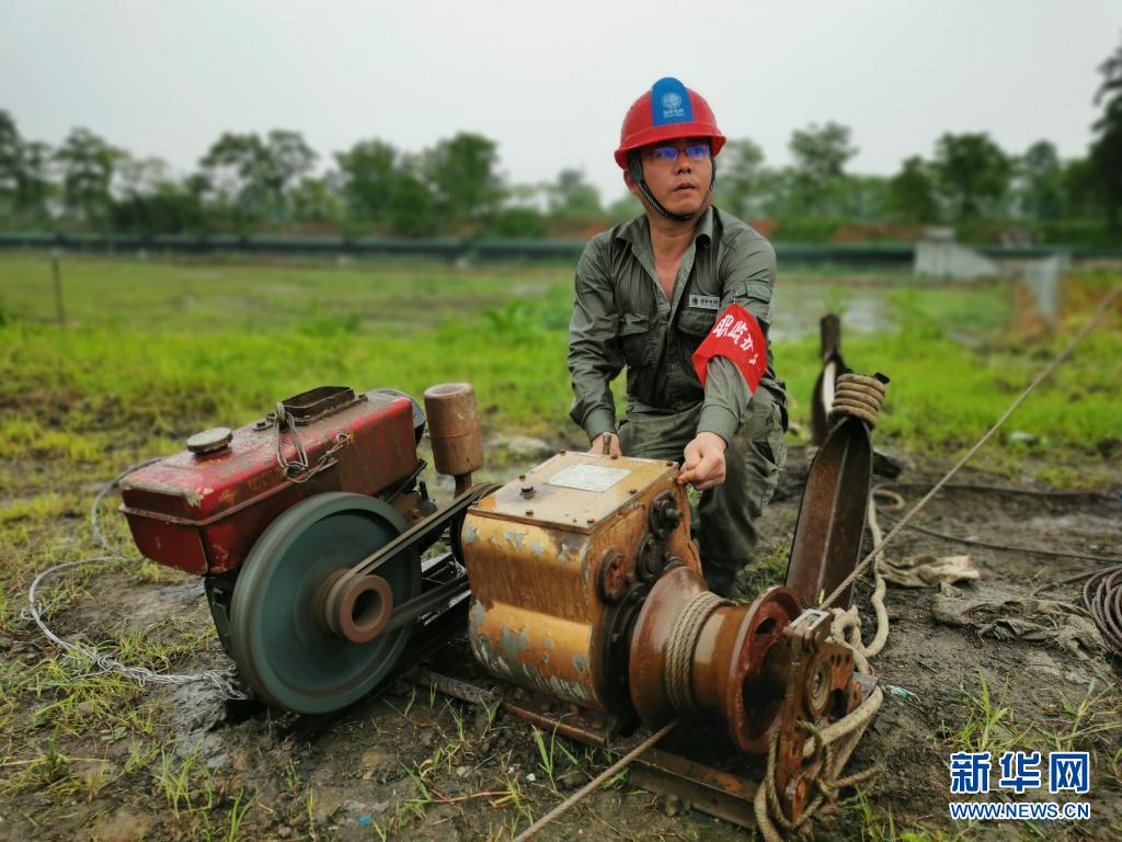 “跑山電工”黨員服務(wù)隊(duì)隊(duì)員操作機(jī)動(dòng)絞磨牽引導(dǎo)線(5月3日攝)。