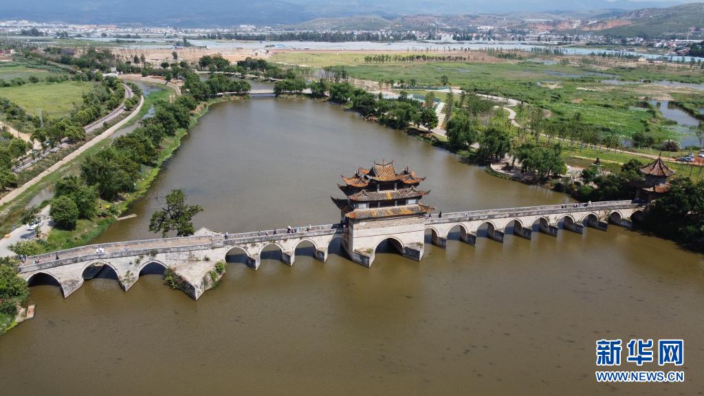 5月3日,游客在云南省紅河哈尼族彝族自治州建水縣建水古城雙龍橋景區(qū)游覽(無人機照片)。新華社發(fā)(楊俊鵬 攝)