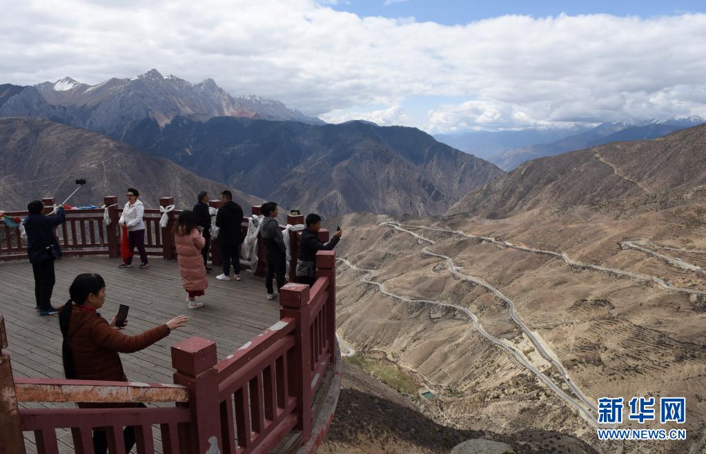 游客在觀景平臺(tái)眺望壯觀的怒江72道拐(5月3日攝)。