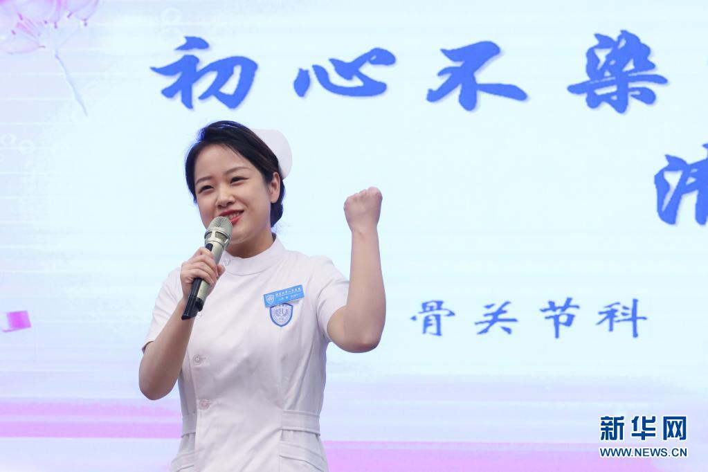 5月10日,北京大學(xué)人民醫(yī)院的一名護(hù)士代表在慶?;顒?dòng)上演講。