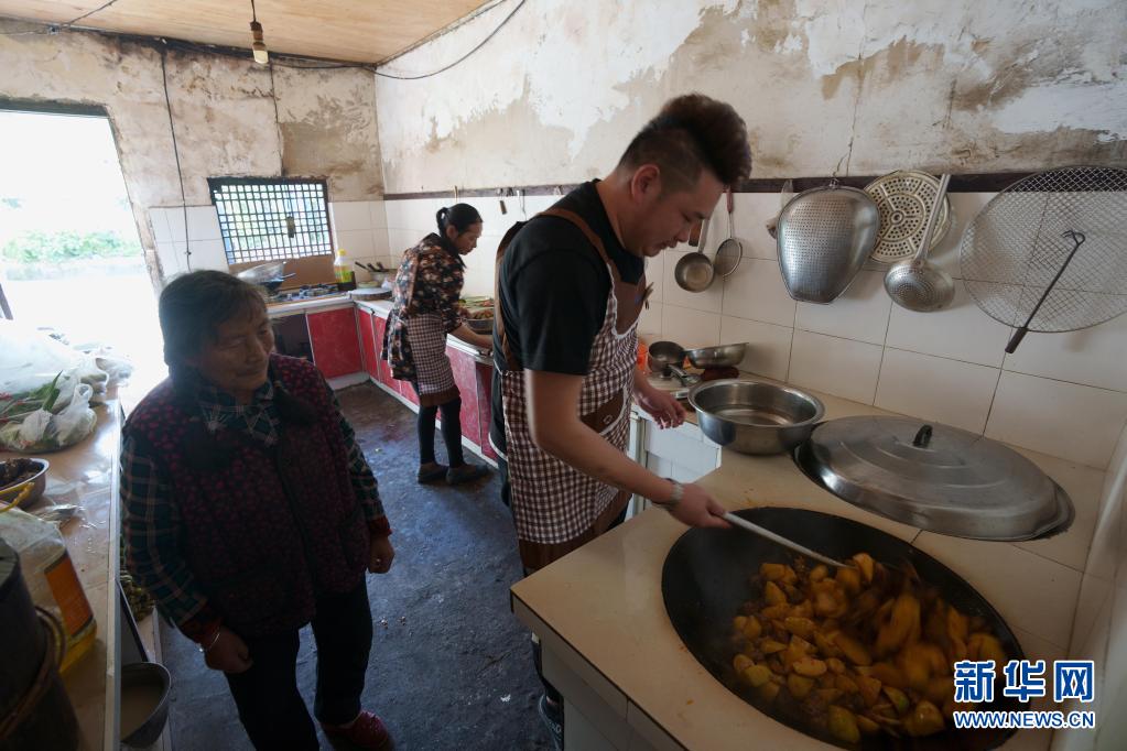5月4日,邱超(右)和母親李蕓香(中)、奶奶在廚房準(zhǔn)備飯菜。 新華社記者 江宏景 攝