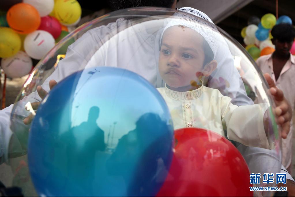 5月13日,在巴基斯坦南部城市卡拉奇,一名兒童在開齋節(jié)慶祝活動(dòng)上玩氣球。新華社發(fā)