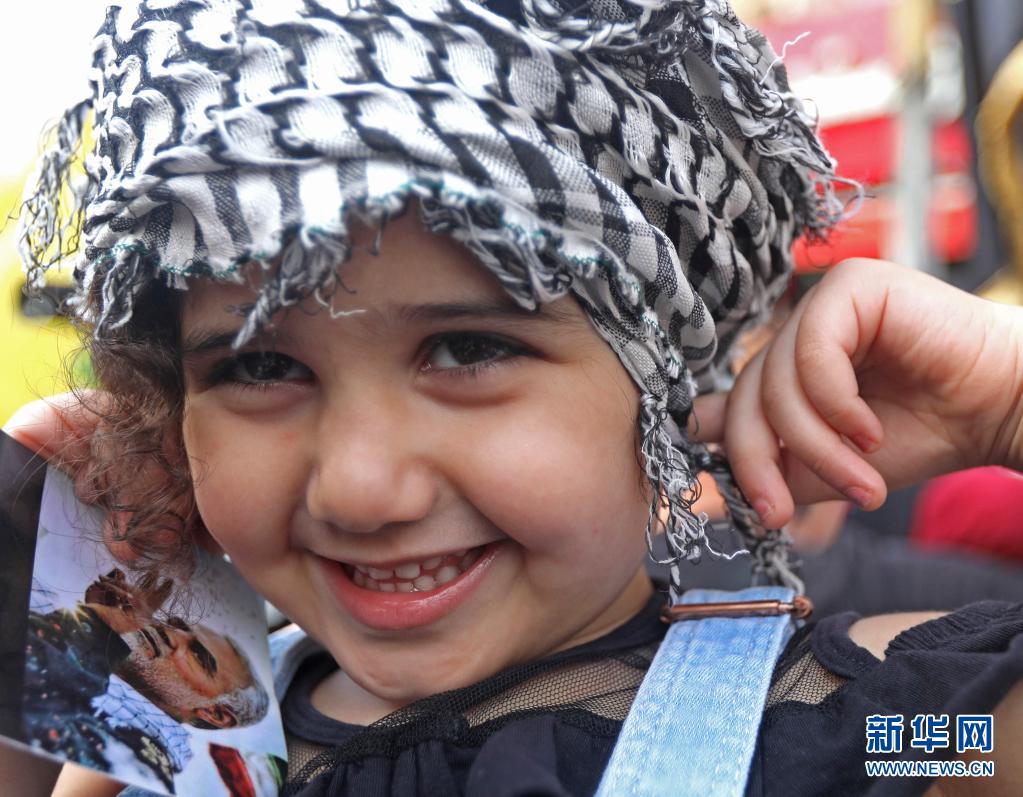 5月15日,一名兒童在黎巴嫩首都貝魯特參加抗議示威活動(dòng),聲援巴勒斯坦民眾。