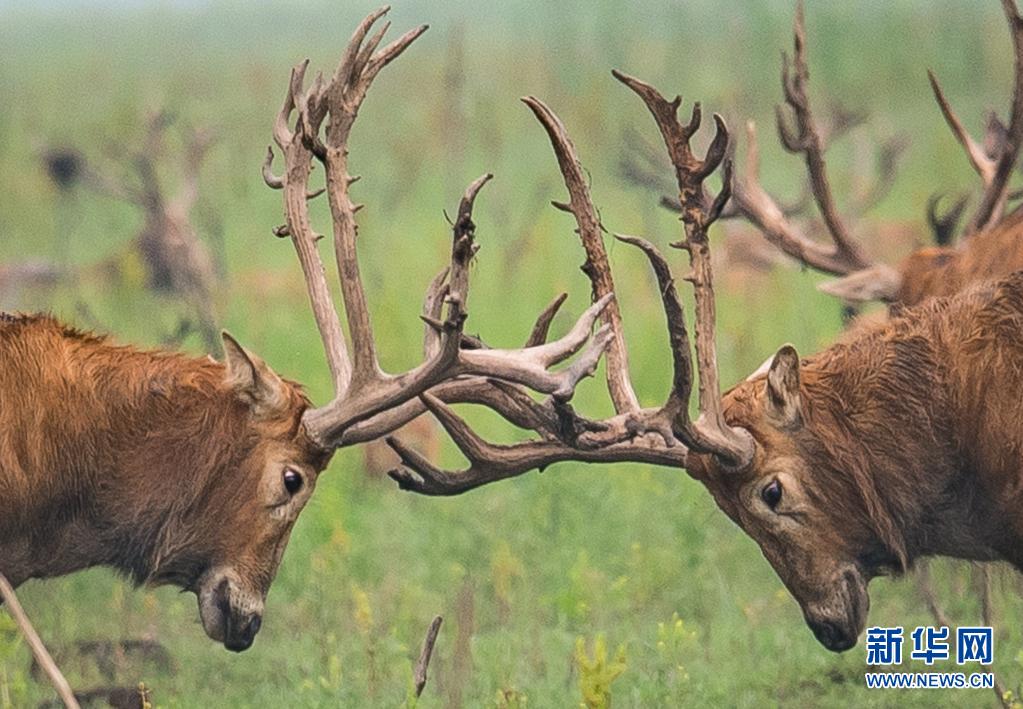 5月17日,麋鹿在石首麋鹿國家級(jí)自然保護(hù)區(qū)內(nèi)活動(dòng)。新華社記者 肖藝九 攝