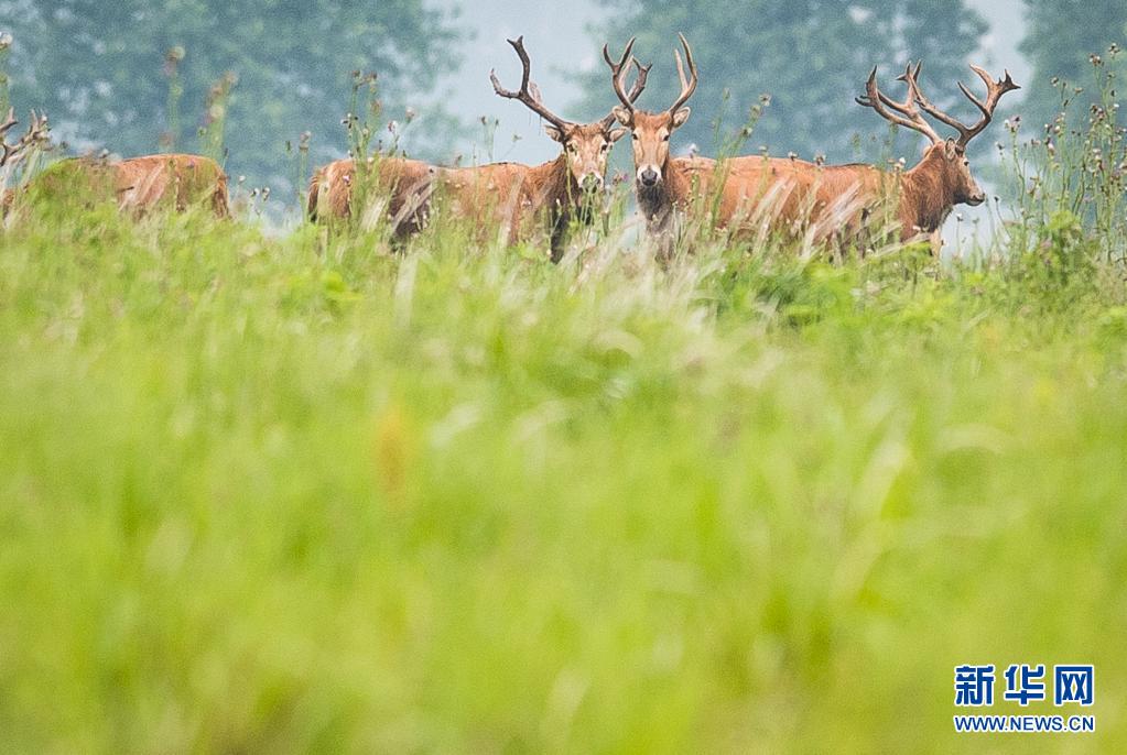 5月17日,一群麋鹿在石首麋鹿國(guó)家級(jí)自然保護(hù)區(qū)內(nèi)活動(dòng)。新華社記者 肖藝九 攝