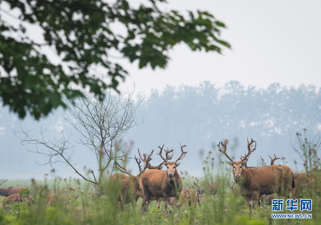 5月17日,一群麋鹿在石首麋鹿國家級自然保護區(qū)內活動。新華社記者 肖藝九 攝