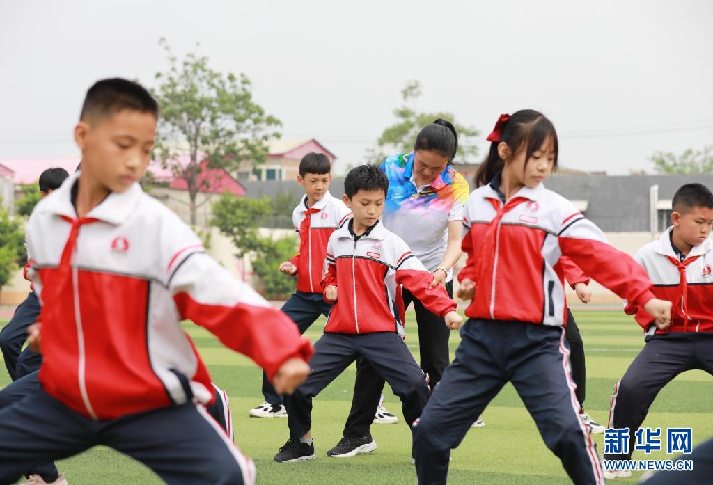 5月19日,邢臺(tái)市內(nèi)丘縣實(shí)驗(yàn)小學(xué)學(xué)生在體育教師的指導(dǎo)下練習(xí)武術(shù)操。